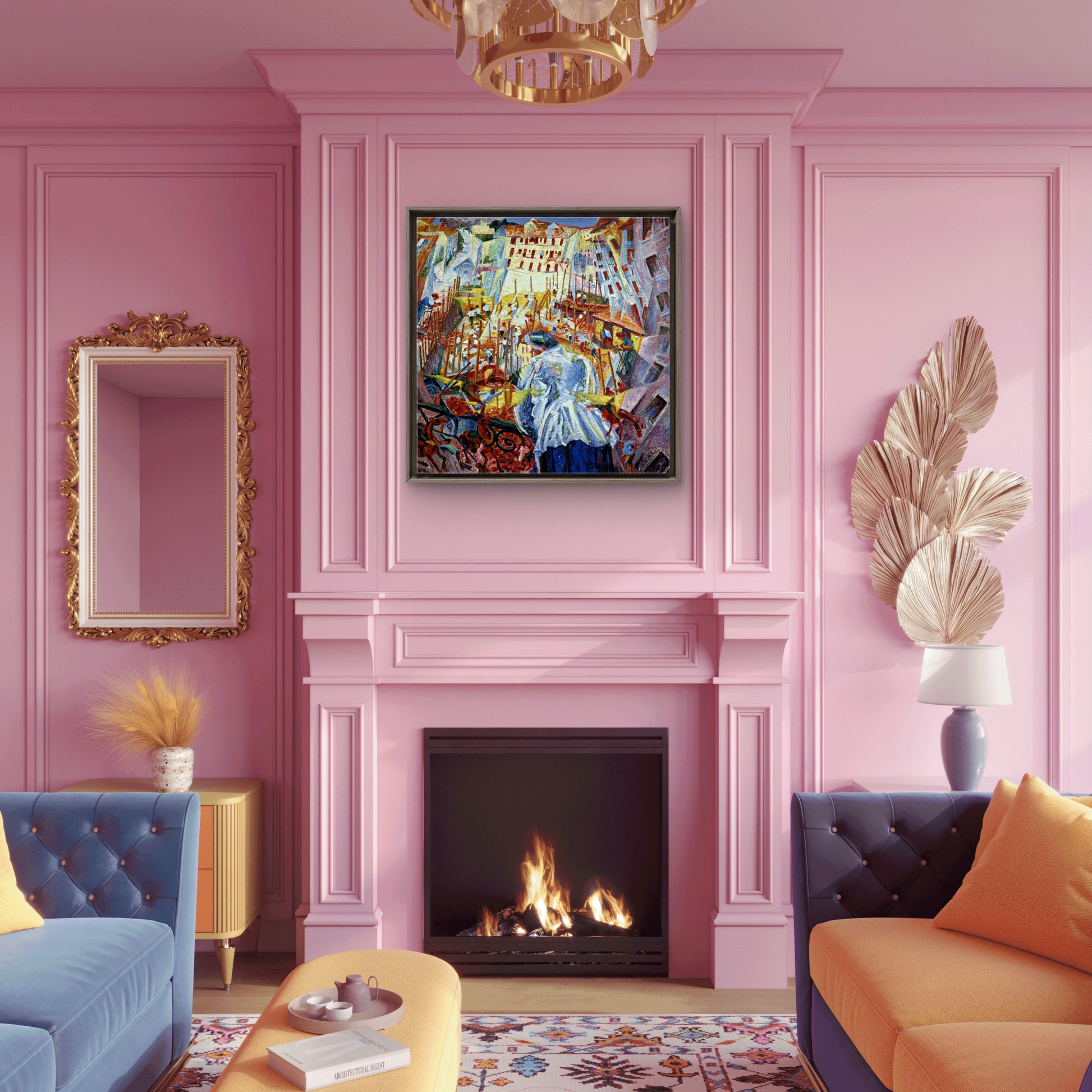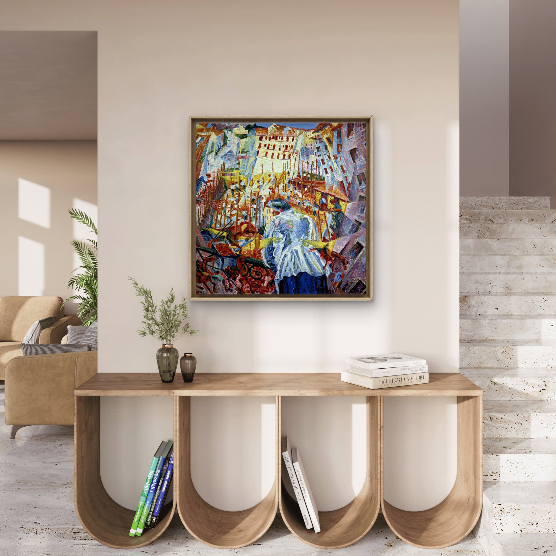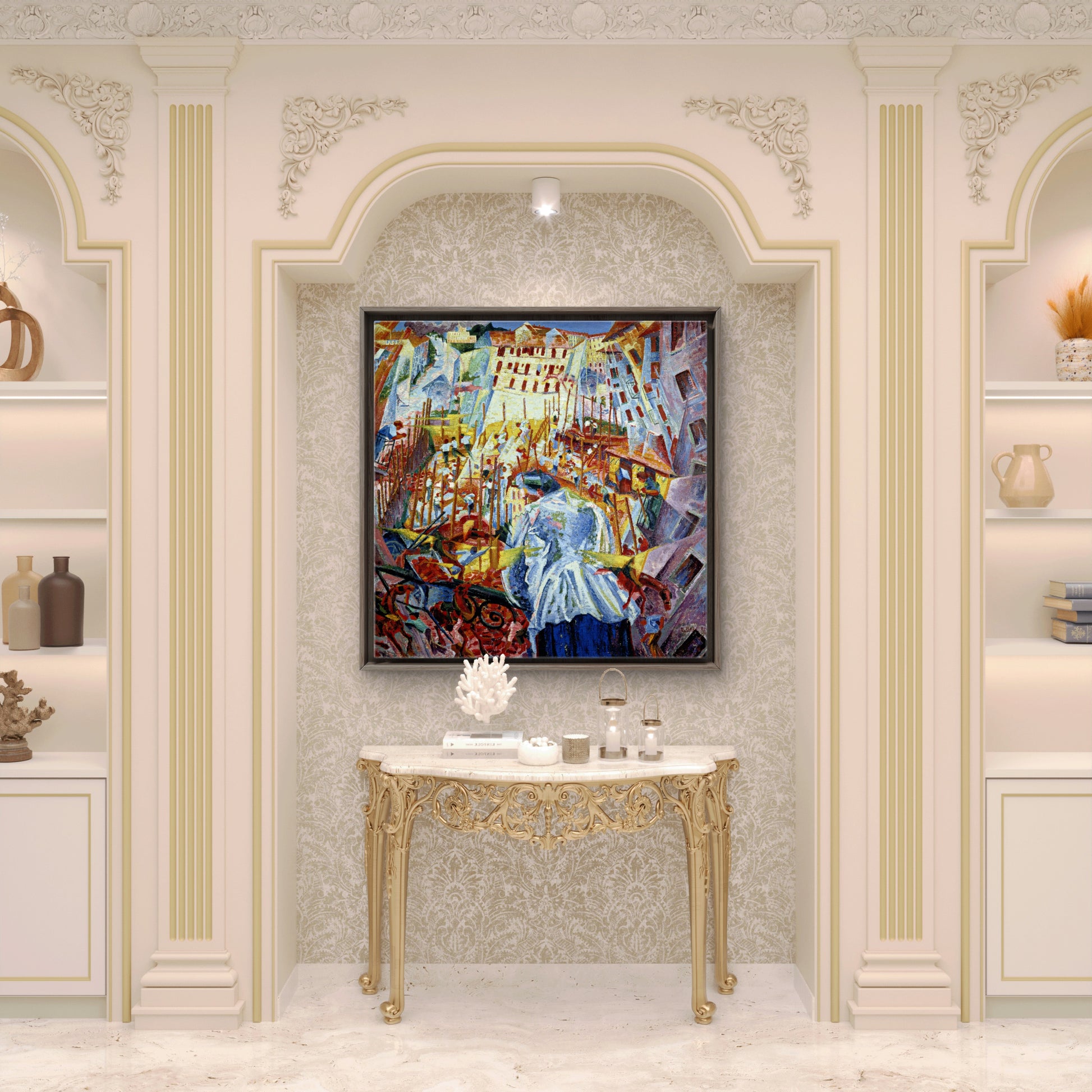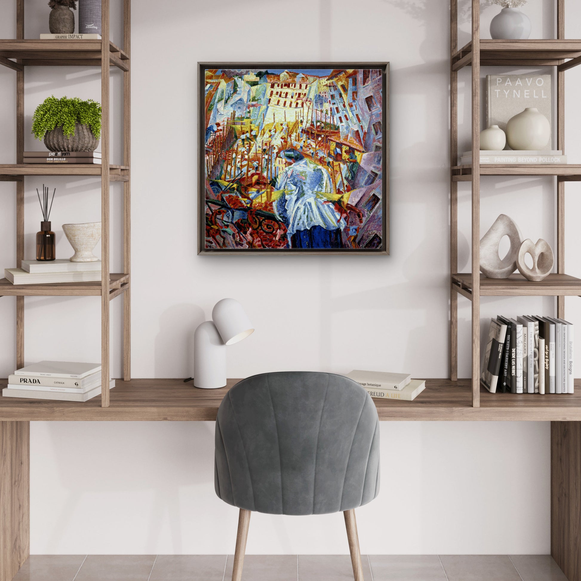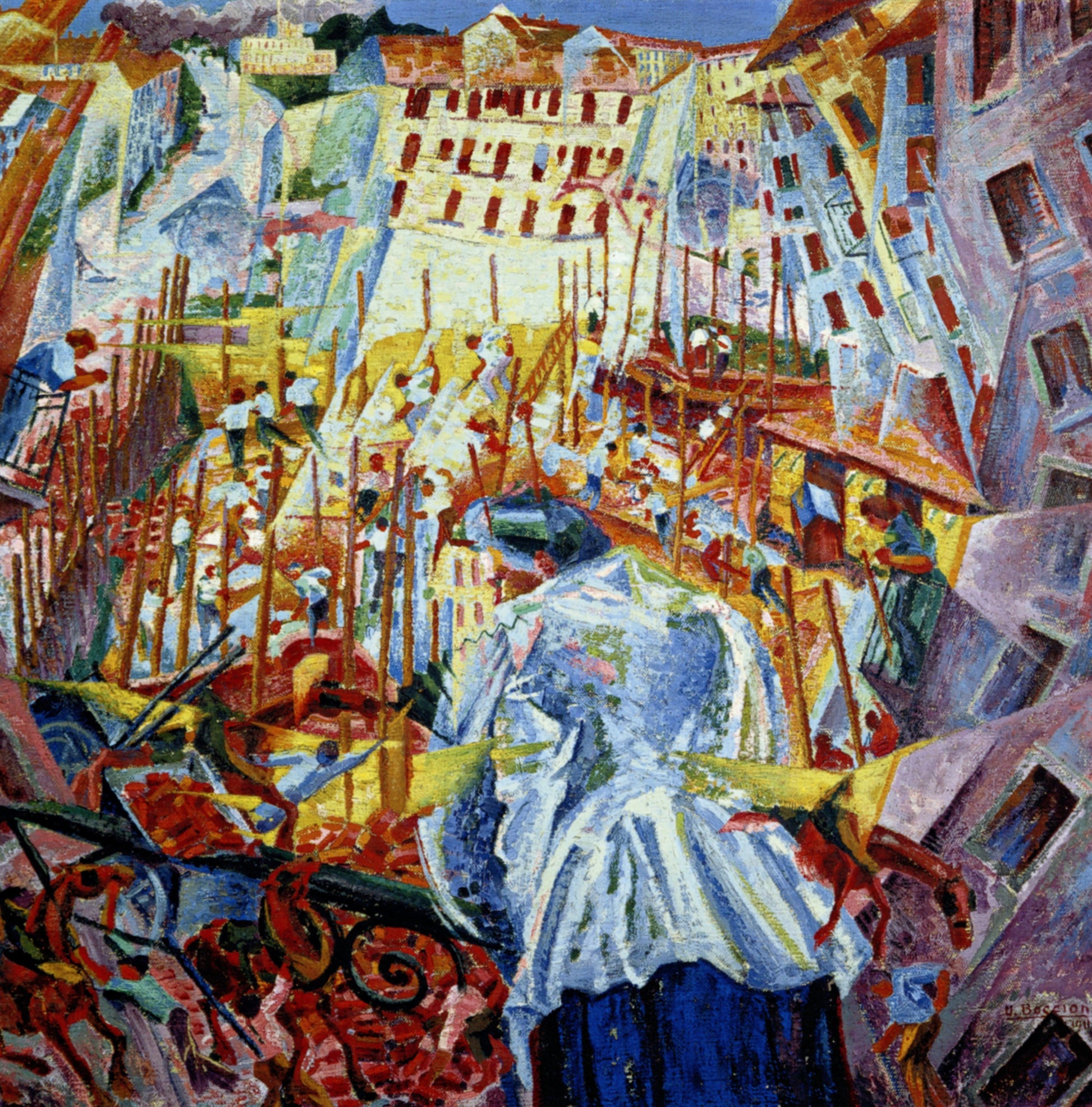 This painting marks a pivotal moment in Futurism, blending distorted perspectives and geometric forms influenced by Expressionism and Cubism. The riotous interplay of color and fragmented shapes vividly conveys the bustling, enveloping force of city expansion, reflecting Boccioni’s radical vision of modernity and the transformative impact of rapid urbanization.