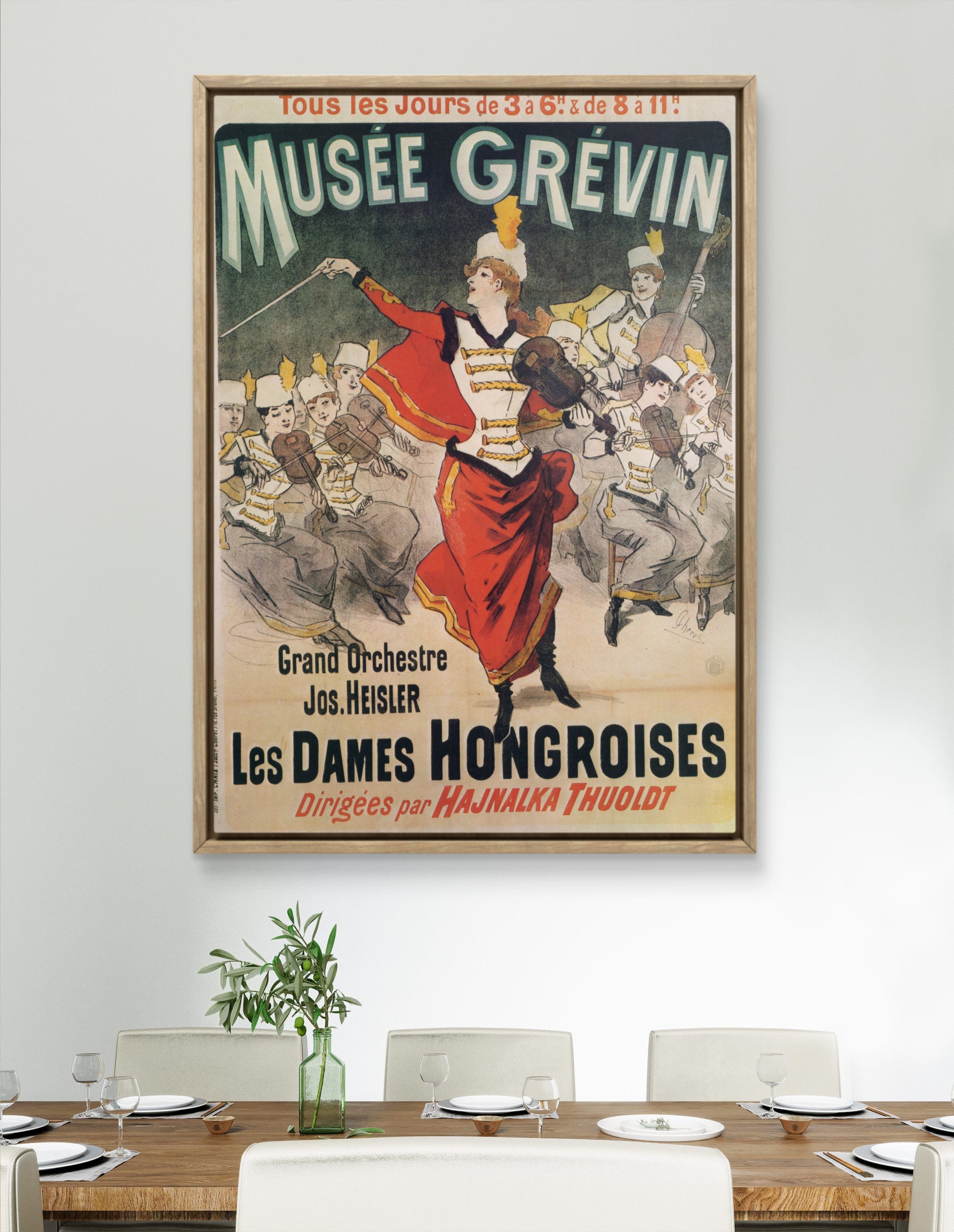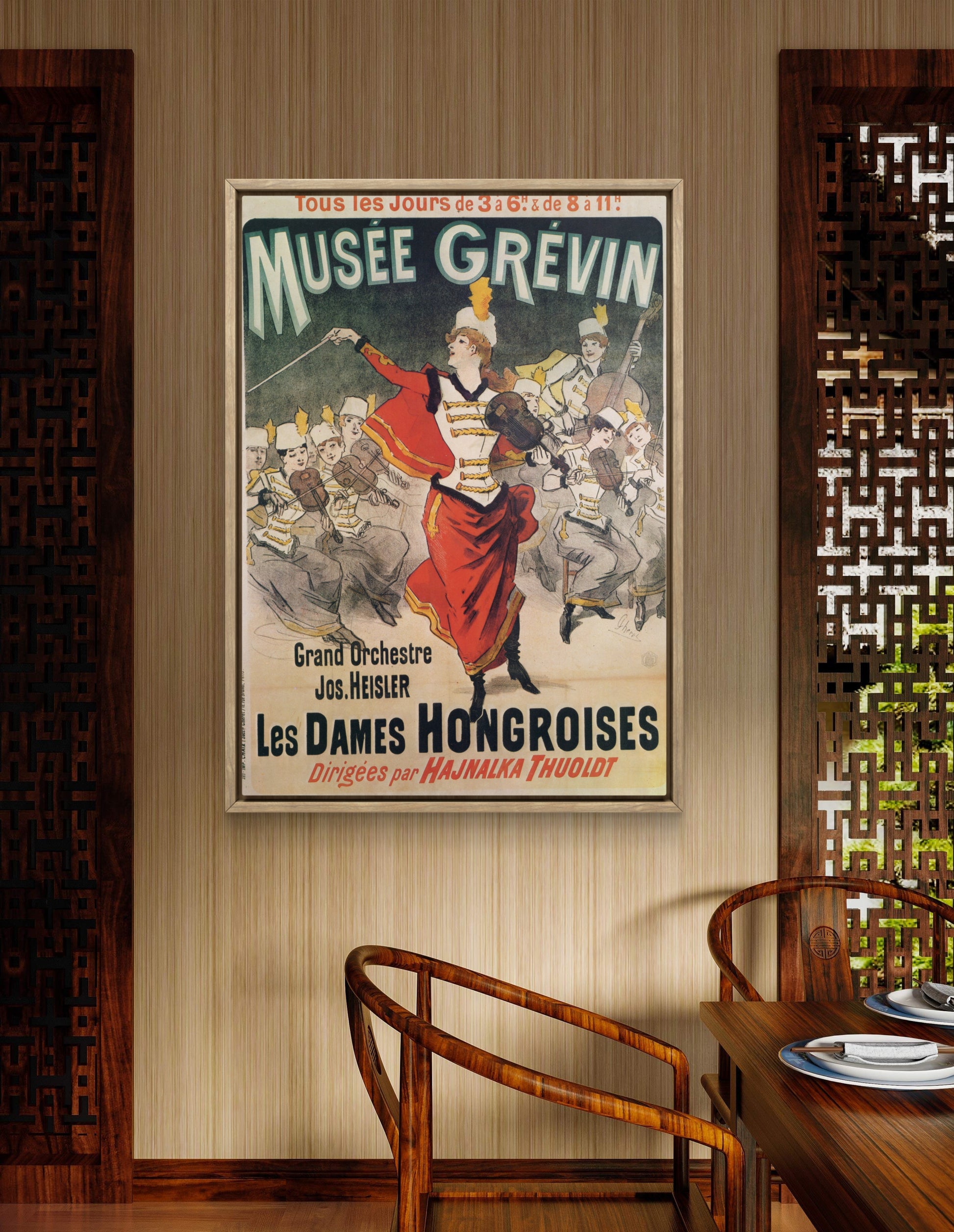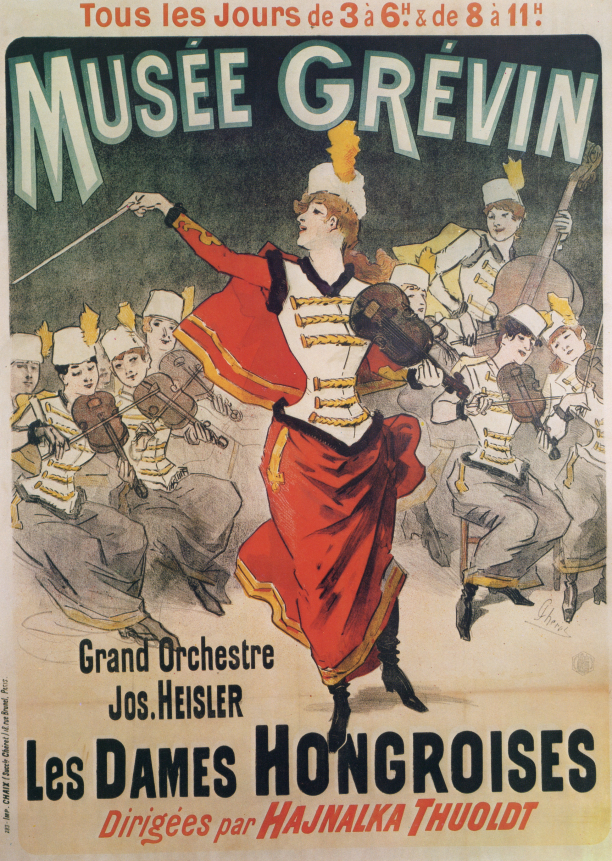 The 1888 "Musée Grévin" poster by Jules Chéret advertises an all-female orchestra called the "Les Dames Hongroises" (The Hungarian Ladies) performing at the Musée Grévin wax museum.