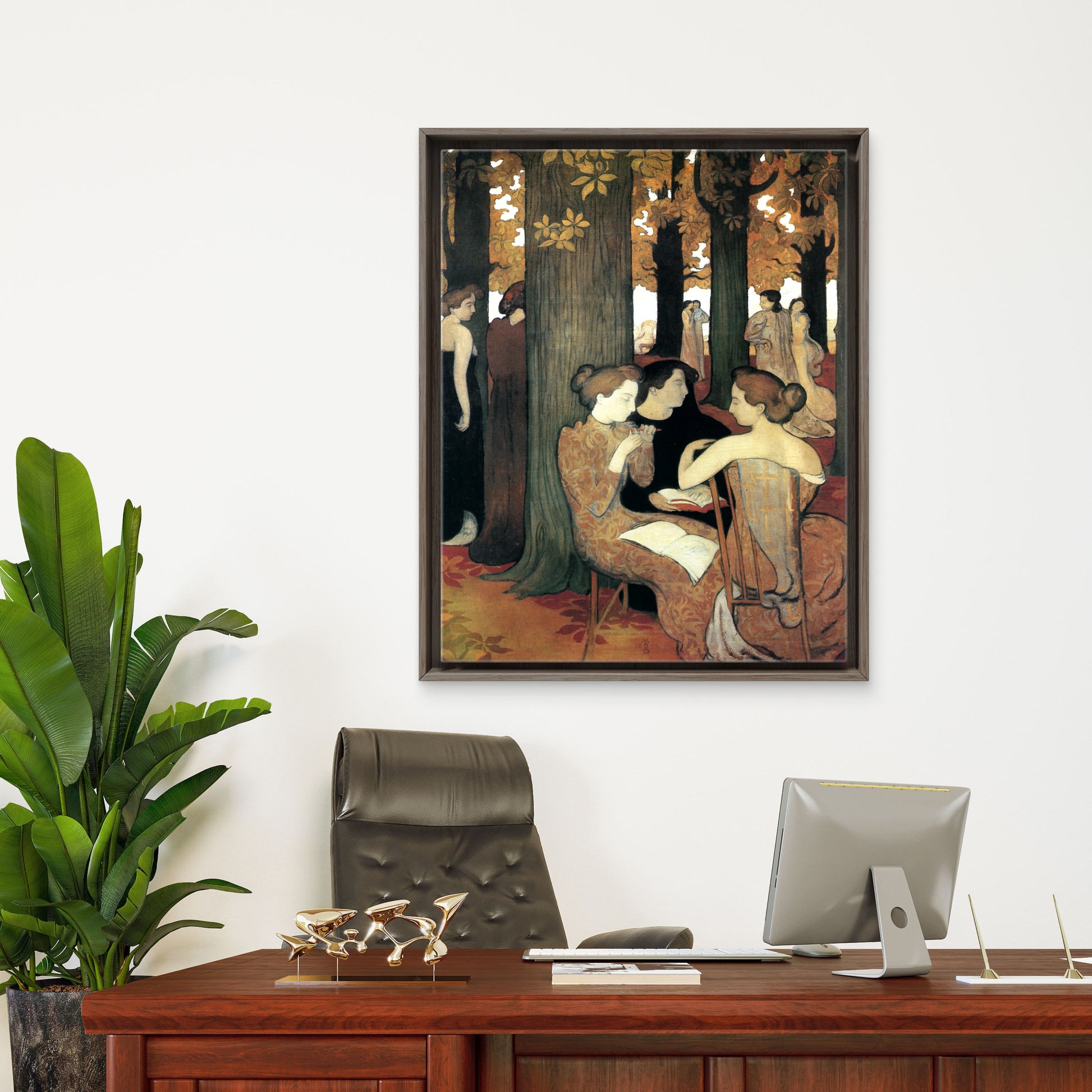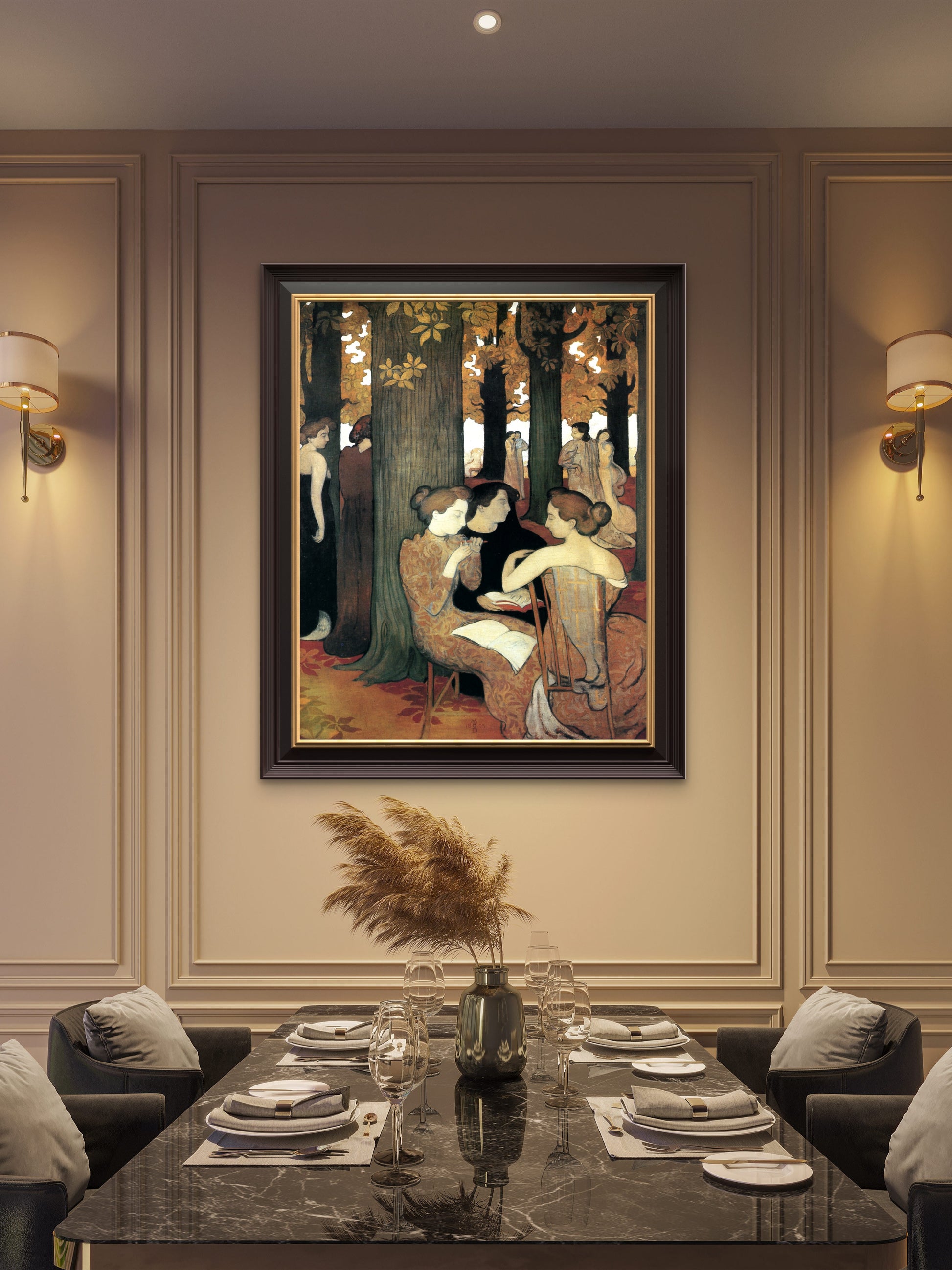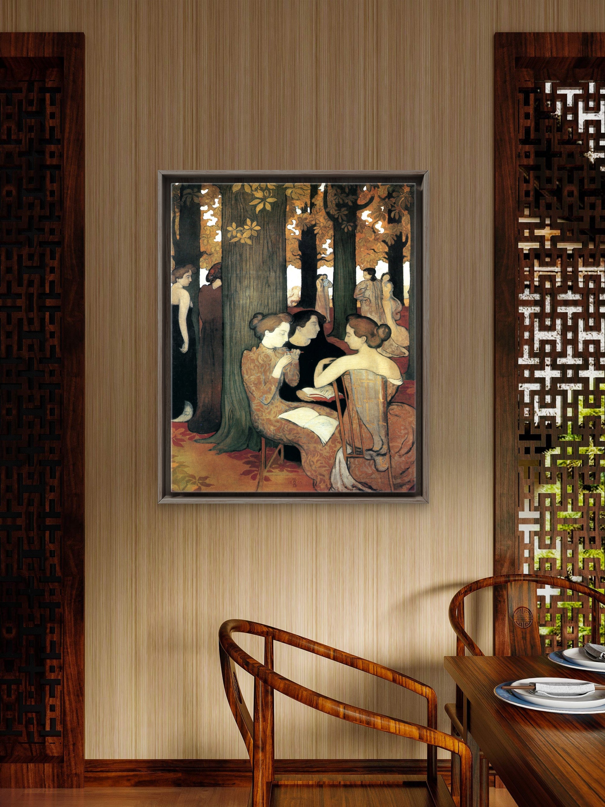 This striking work by Maurice Denis updates a classical theme with a modern Symbolist vision. The figures of the muses, modeled after the artist's wife, Marthe, are rendered in simplified forms and unreal, autumnal colors. Set on the terrace of Saint-Germain-en-Laye, the painting creates a flattened, mystical space of deep introspection and creative inspiration.