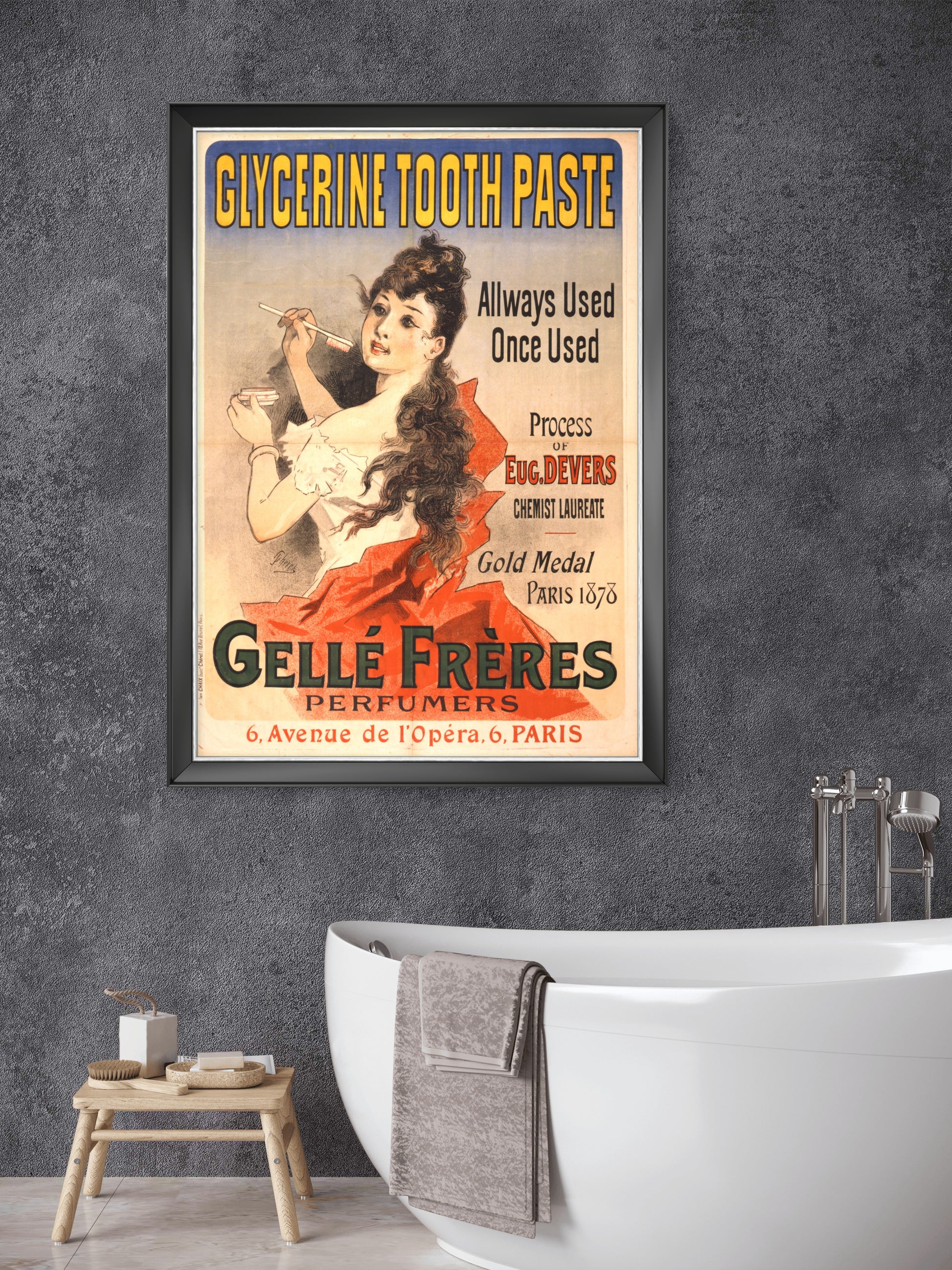 This poster advertises Gellé Frères Glycerine Tooth Paste, a product from the Parisian perfumery Gellé Frères. It was created by the French artist Jules Chéret, often referred to as the "father of the modern poster," who was a master of the Belle Époque style. The poster features a joyful, lively woman—a "Chérette" as they were known—which was a common and influential motif in Chéret's work. The poster mentions that the product's process was created by Eug. Devers, "Chemist Laureate," and won a "Gold Medal" in Paris in 1878, which is a key detail that helps date the original poster. The company's address is listed as 6, Avenue de l'Opéra, 6, Paris.