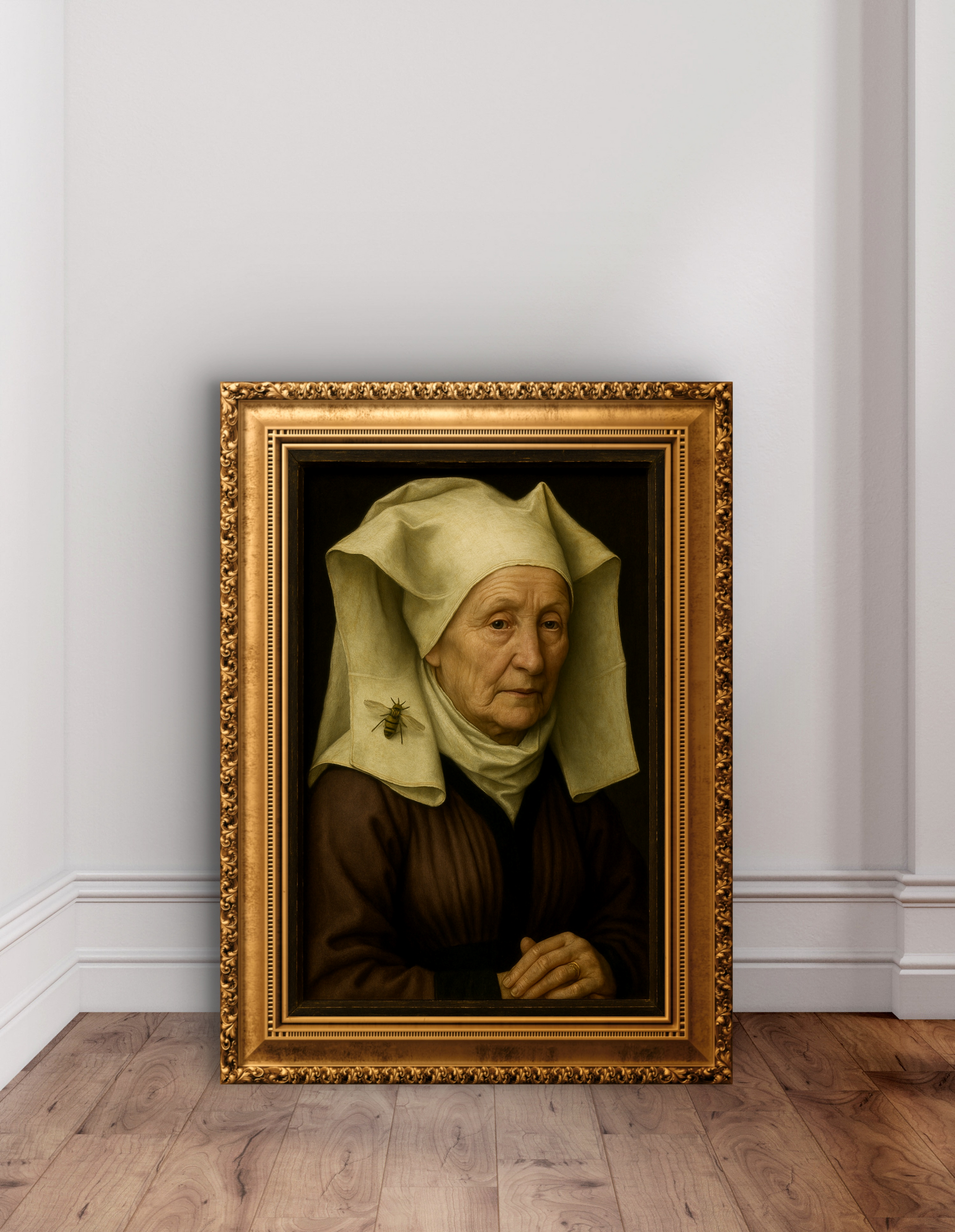 This remarkable portrait, from the school of Hans Memling, captures the quiet dignity of an elderly woman in the Northern Renaissance tradition. The bee on her veil symbolizes purity, industriousness, and faith, while Memling’s attention to human expression gives the sitter a serene presence. A deeply human work that balances realism and symbolism.