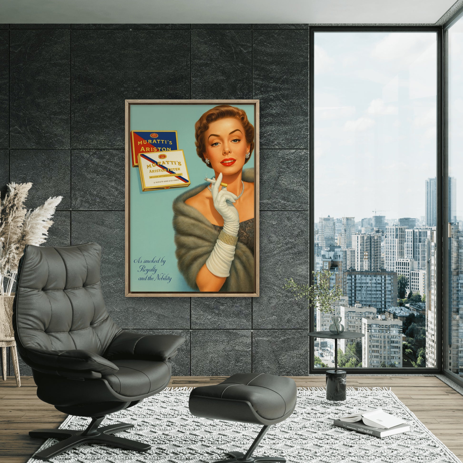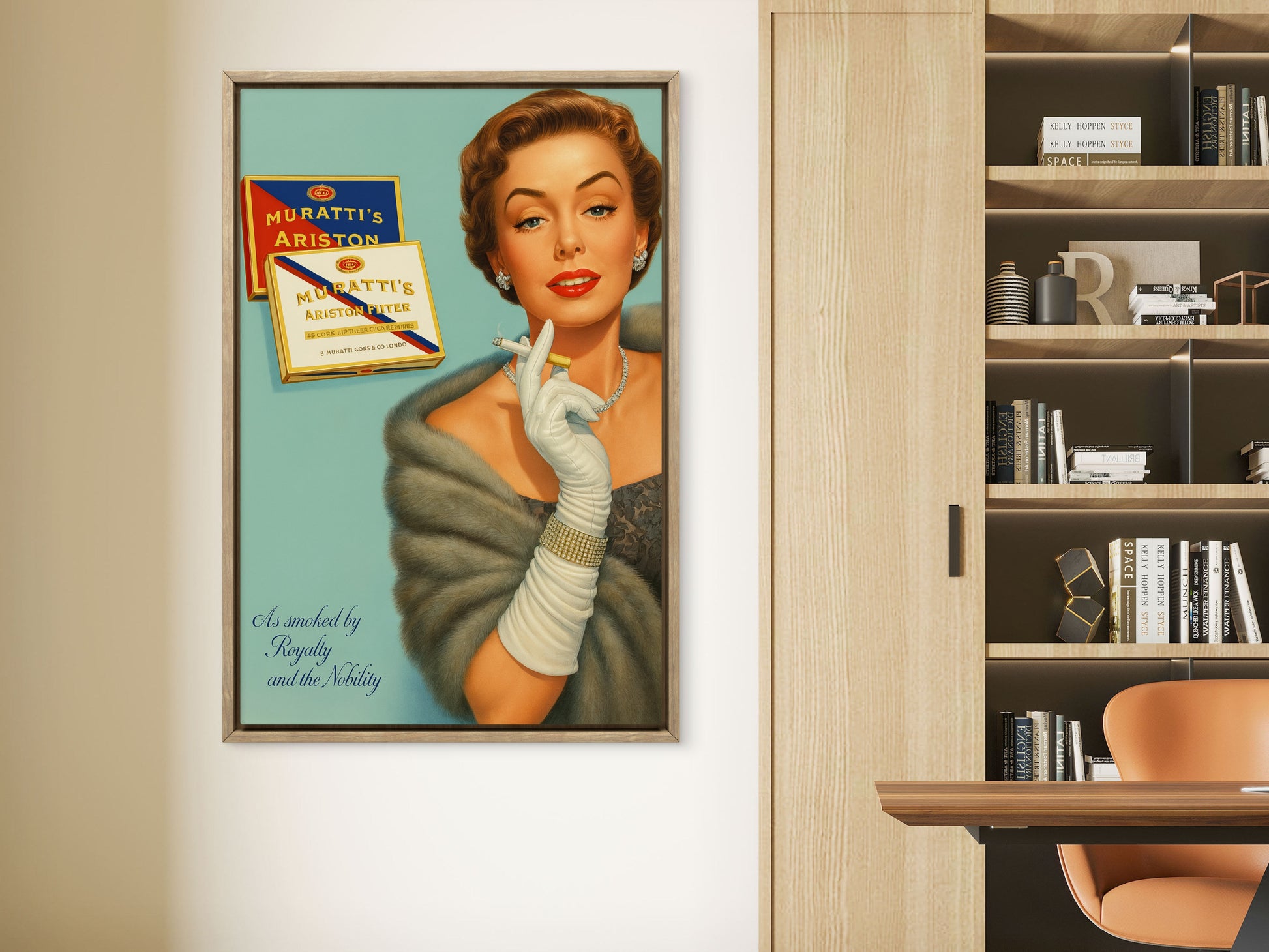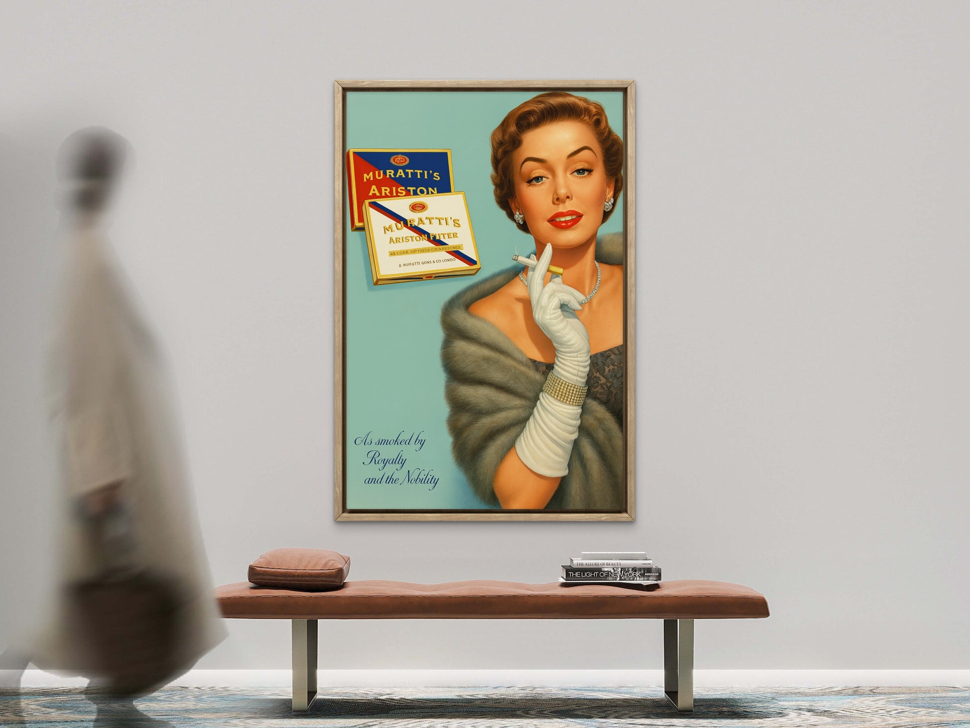 This elegant vintage advertisement captures the height of postwar glamour and aspiration. A poised woman draped in fur and diamonds gazes confidently at the viewer, a Muratti’s Ariston cigarette held delicately between gloved fingers — a symbol of refinement and privilege. Rendered in lush mid-century realism, the artwork celebrates the era’s obsession with class, luxury, and flawless presentation.