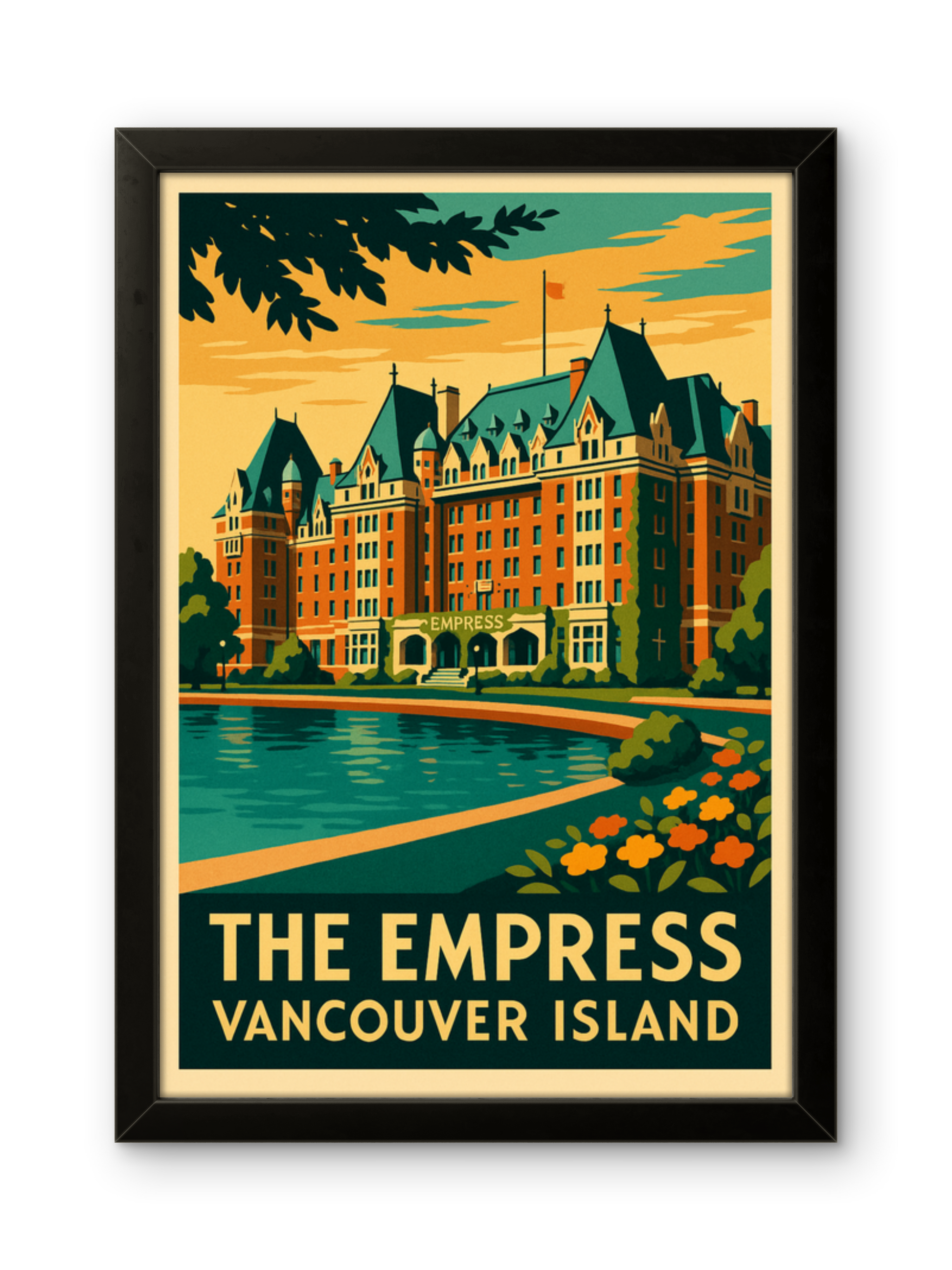 Celebrate the grandeur and grace of Vancouver Island’s crown jewel with this elegant artwork honouring the Fairmont Empress. Overlooking Victoria’s picturesque Inner Harbour since 1908, The Empress is a symbol of refined hospitality, historic beauty, and coastal charm.