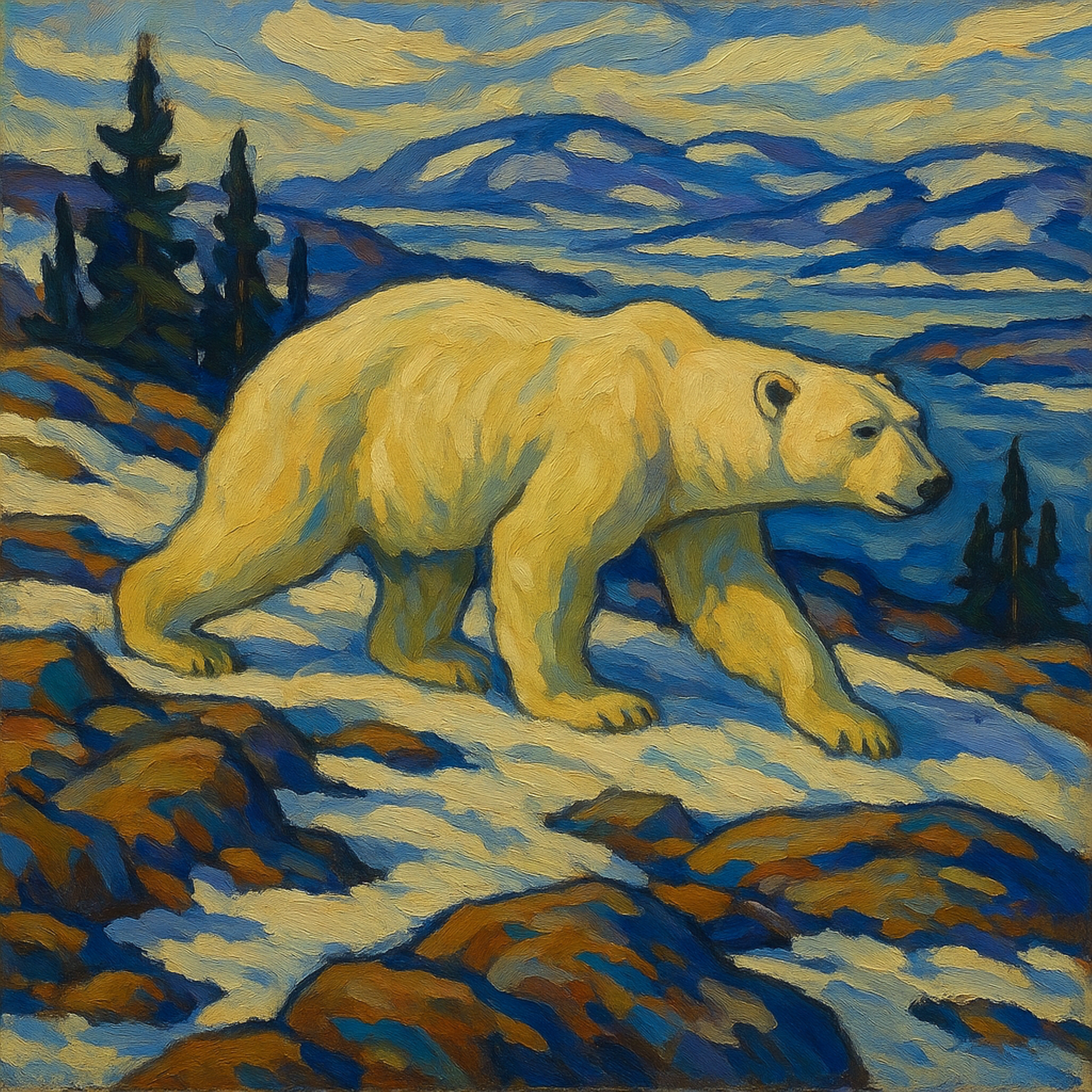 This powerful artwork honours the enduring spirit of the North with a striking portrait of a polar bear, rendered in the bold, expressive style inspired by Canada’s great 20th-century landscape artists. Strong brushstrokes, sculptural forms, and a limited yet evocative palette of cool whites, deep blues, and subtle greys capture the quiet strength and stoic beauty of this Arctic icon.