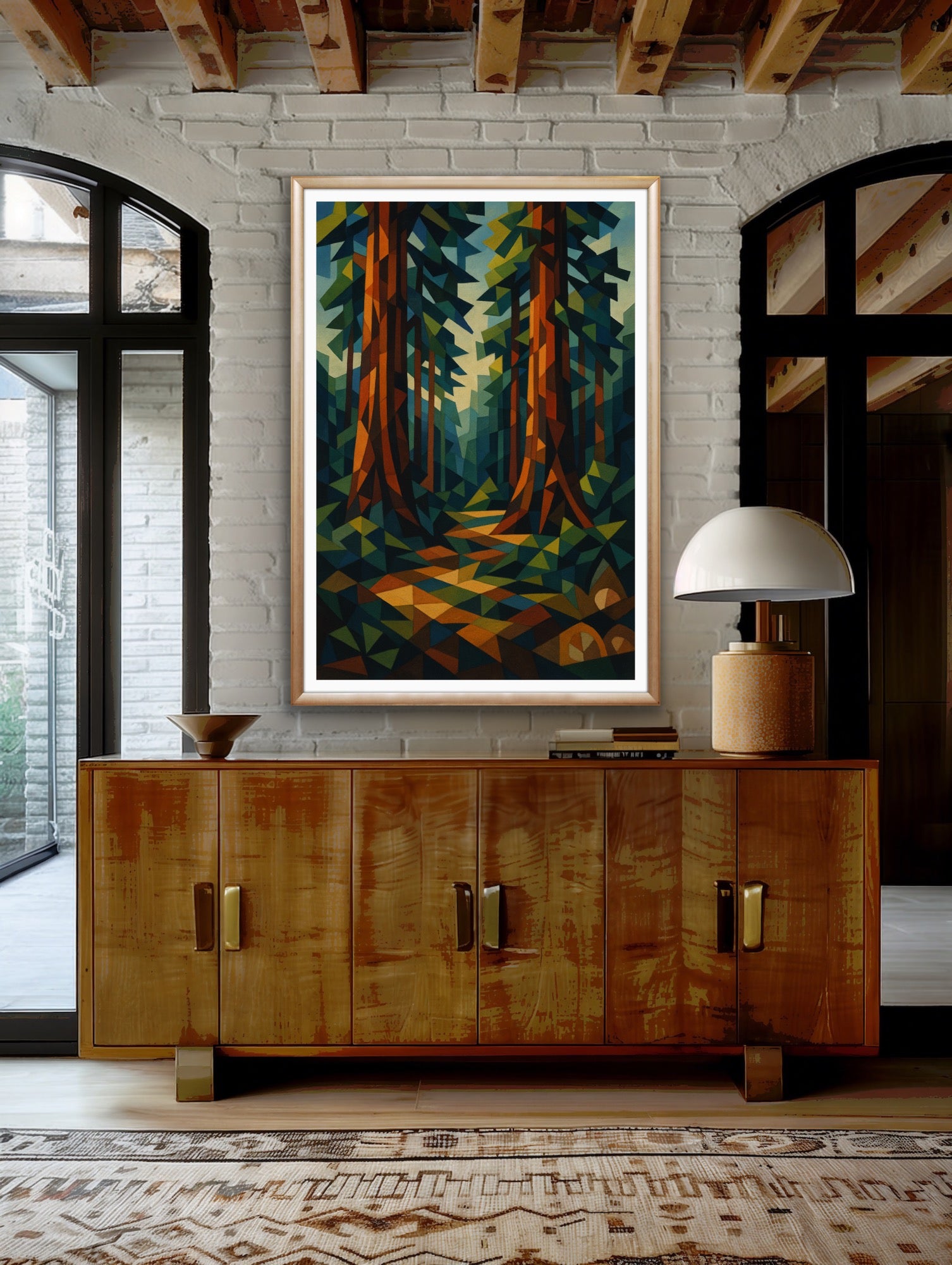 This striking modernist artwork celebrates the quiet power and hidden beauty of the West Coast rainforest. Bold lines and simplified forms capture the deep red roots weaving through rich earth, evoking both the resilience of ancient trees and the interconnectedness of life beneath the forest floor.