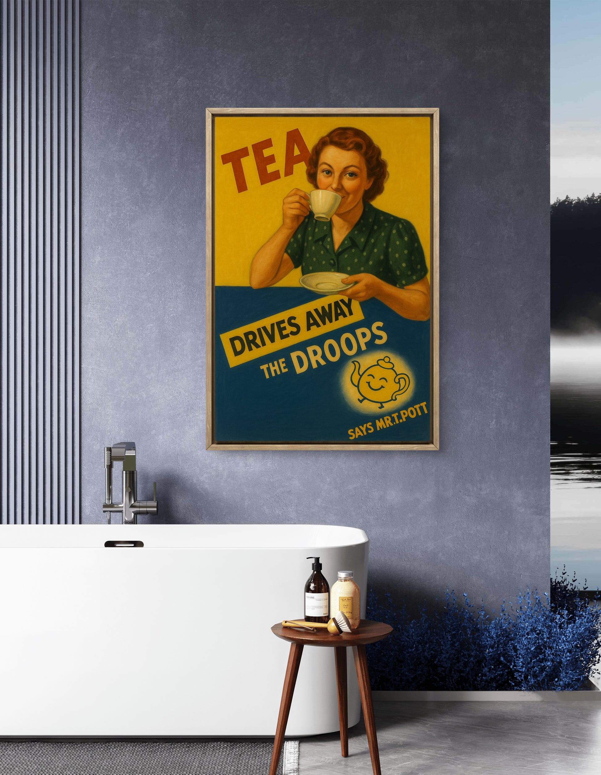 This vintage pre-war poster is a wonderful example of early 20th-century advertising, blending charm, humor, and practicality. With its bold slogan “Tea drives away the droops,” it reflects the period’s emphasis on everyday comforts during uncertain times. The playful teapot mascot and bright, optimistic colors make it not just an advertisement but a piece of cultural history. Collectors will appreciate its nostalgic appeal and the way it celebrates tea as both a daily ritual and a source of uplift.