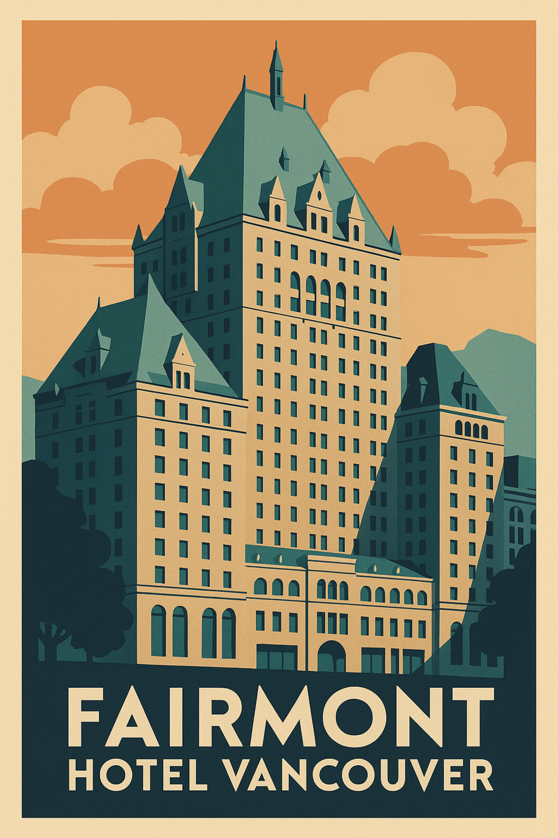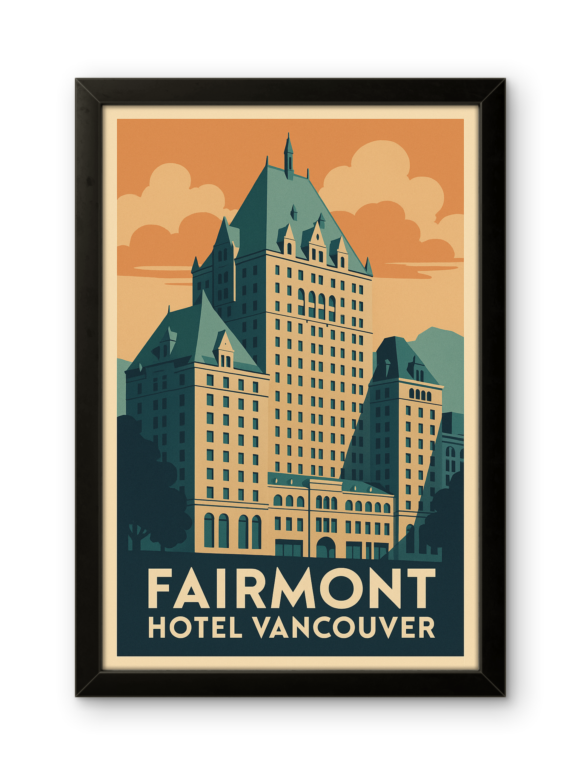 Celebrate the timeless elegance of Vancouver with this refined artwork honouring the Fairmont Hotel Vancouver. Known fondly as the “Grand Lady of Georgia Street,” this storied hotel has welcomed royalty, celebrities, and travellers from around the world since 1939.