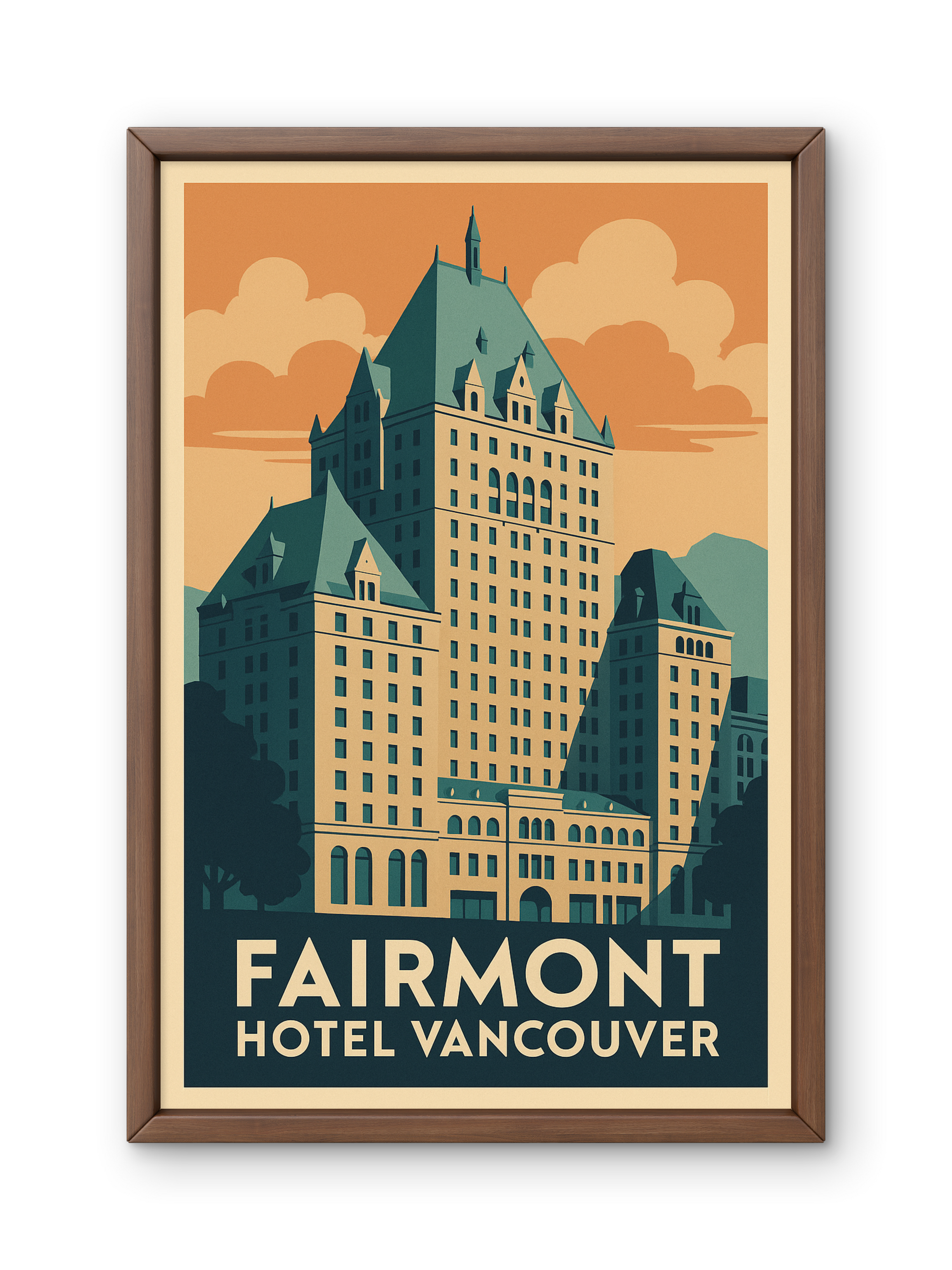 Part of our Elegant Canadian Travel series, this piece captures the hotel’s chateau-inspired silhouette against Vancouver’s coastal mountains, rendered in a sophisticated palette of forest greens and warm neutrals. It evokes the golden age of rail and steamship travel, inviting you to step into a world where grandeur meets West Coast charm.