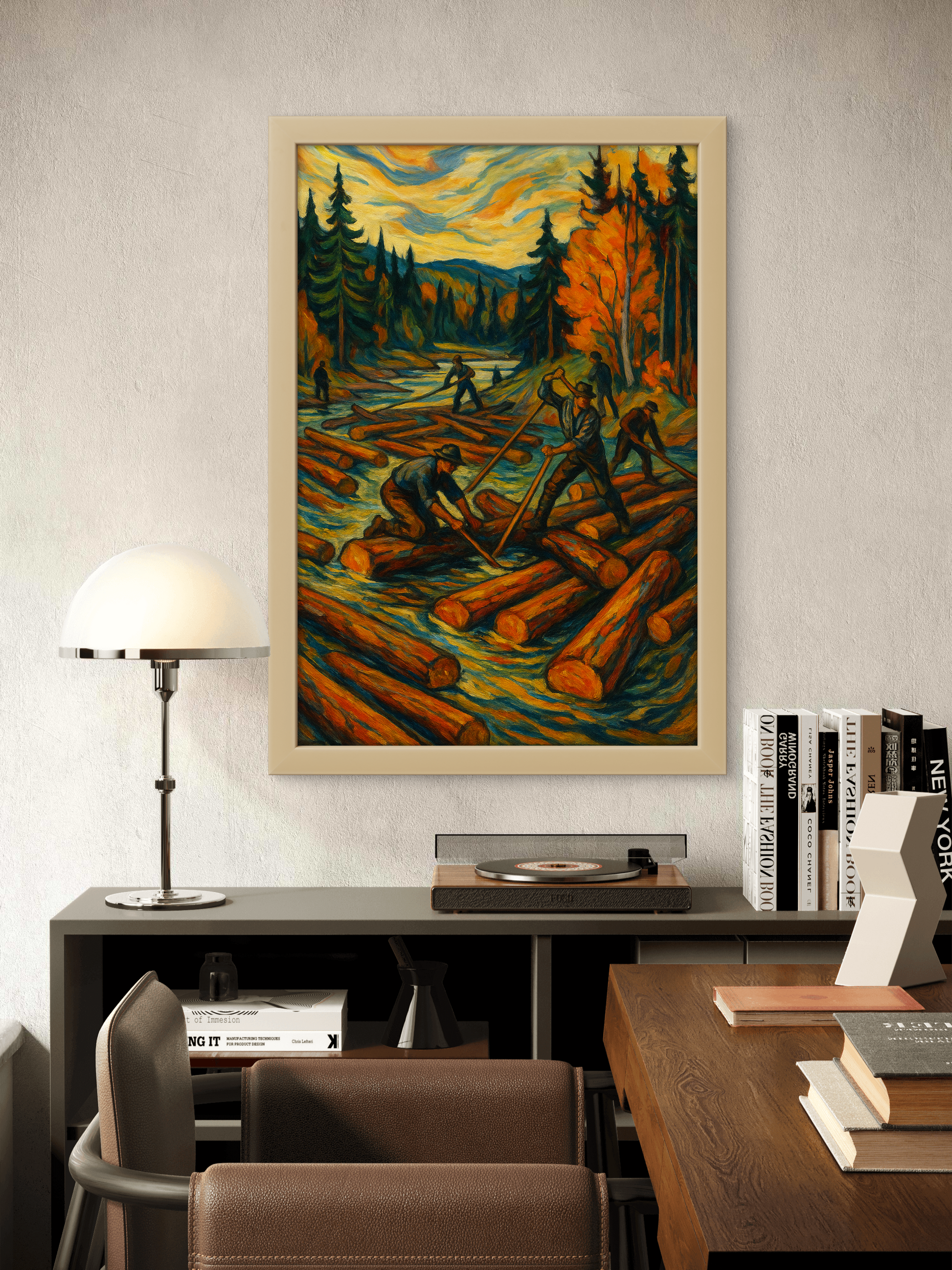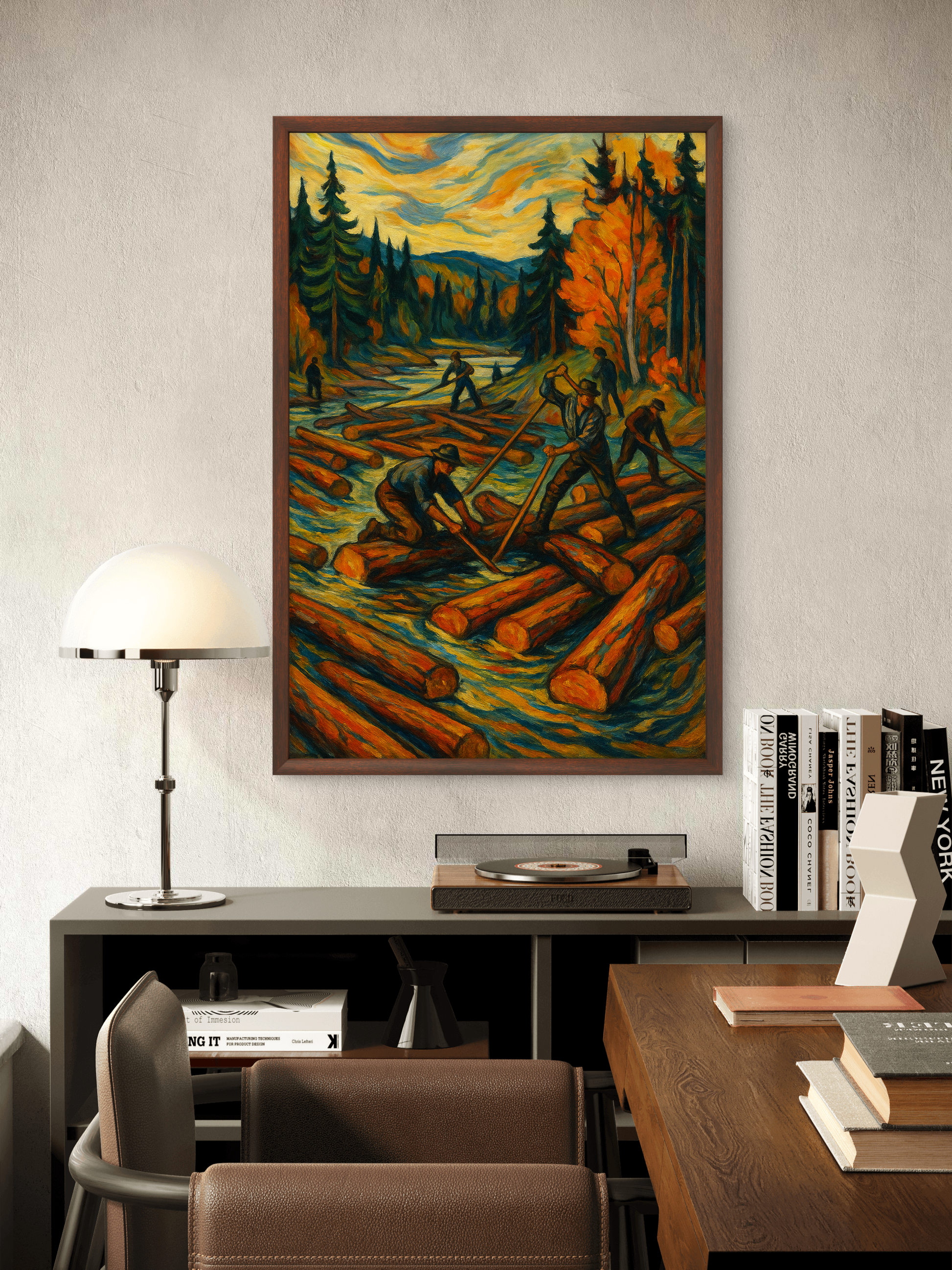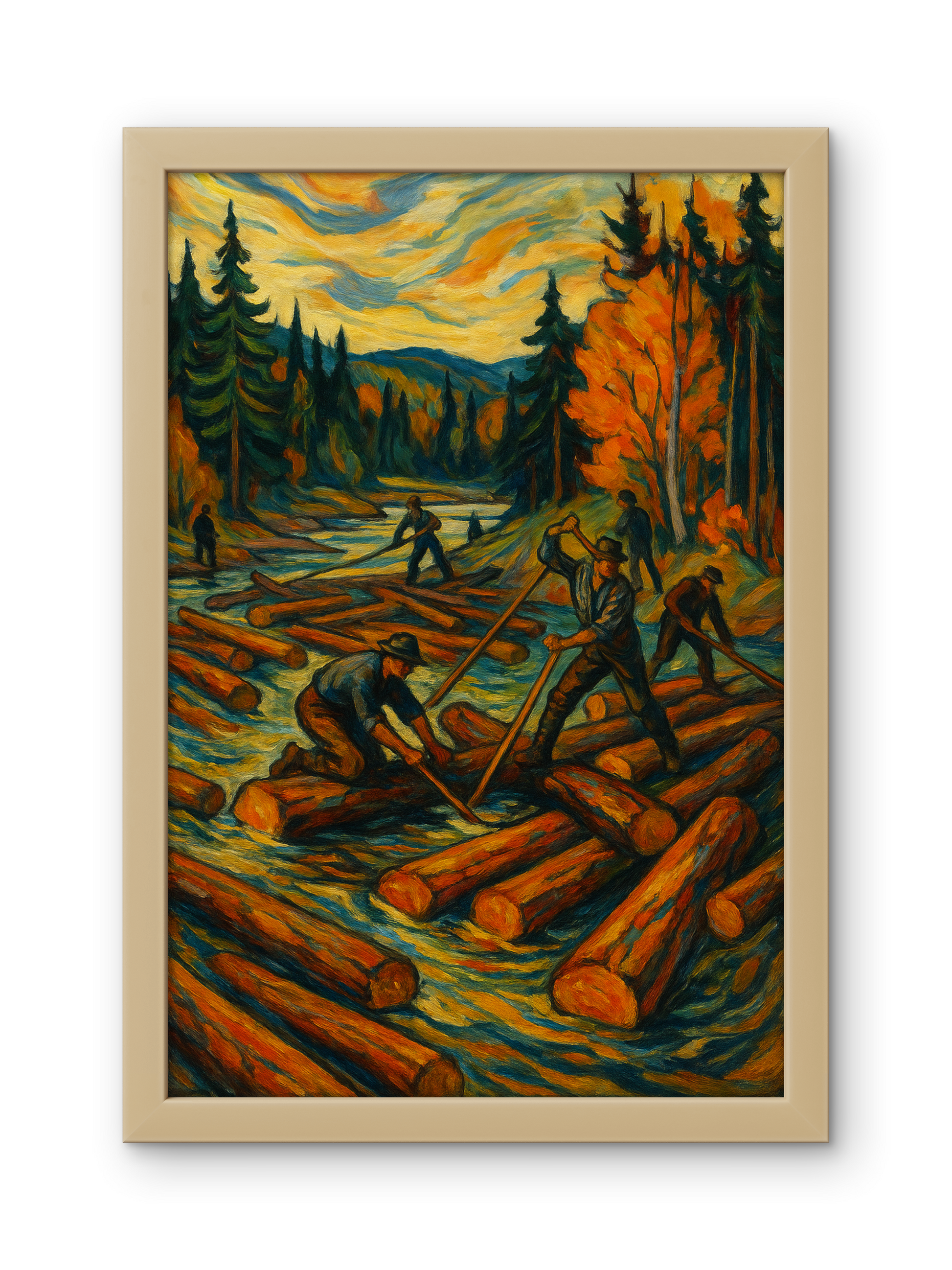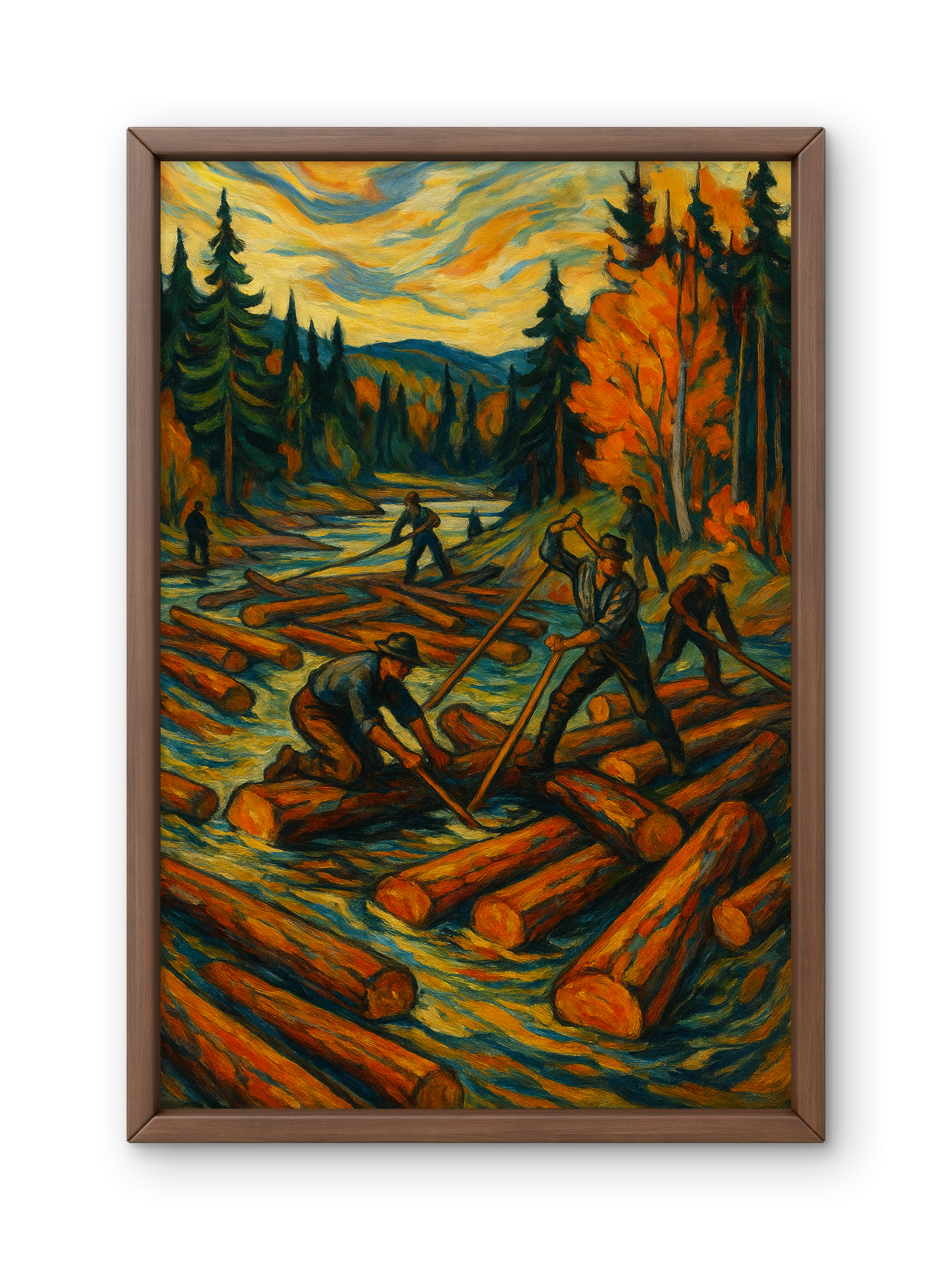 A tribute to the unsung heroes of Canada’s wild frontier, The Log Rollers of British Columbia captures the raw strength and rhythm of river life. Rendered in a bold, expressive style reminiscent of the Group of Seven, this artwork blends deep forest greens, fiery autumn tones, and swirling skies into a dynamic portrayal of loggers steering timber through a churning mountain stream.