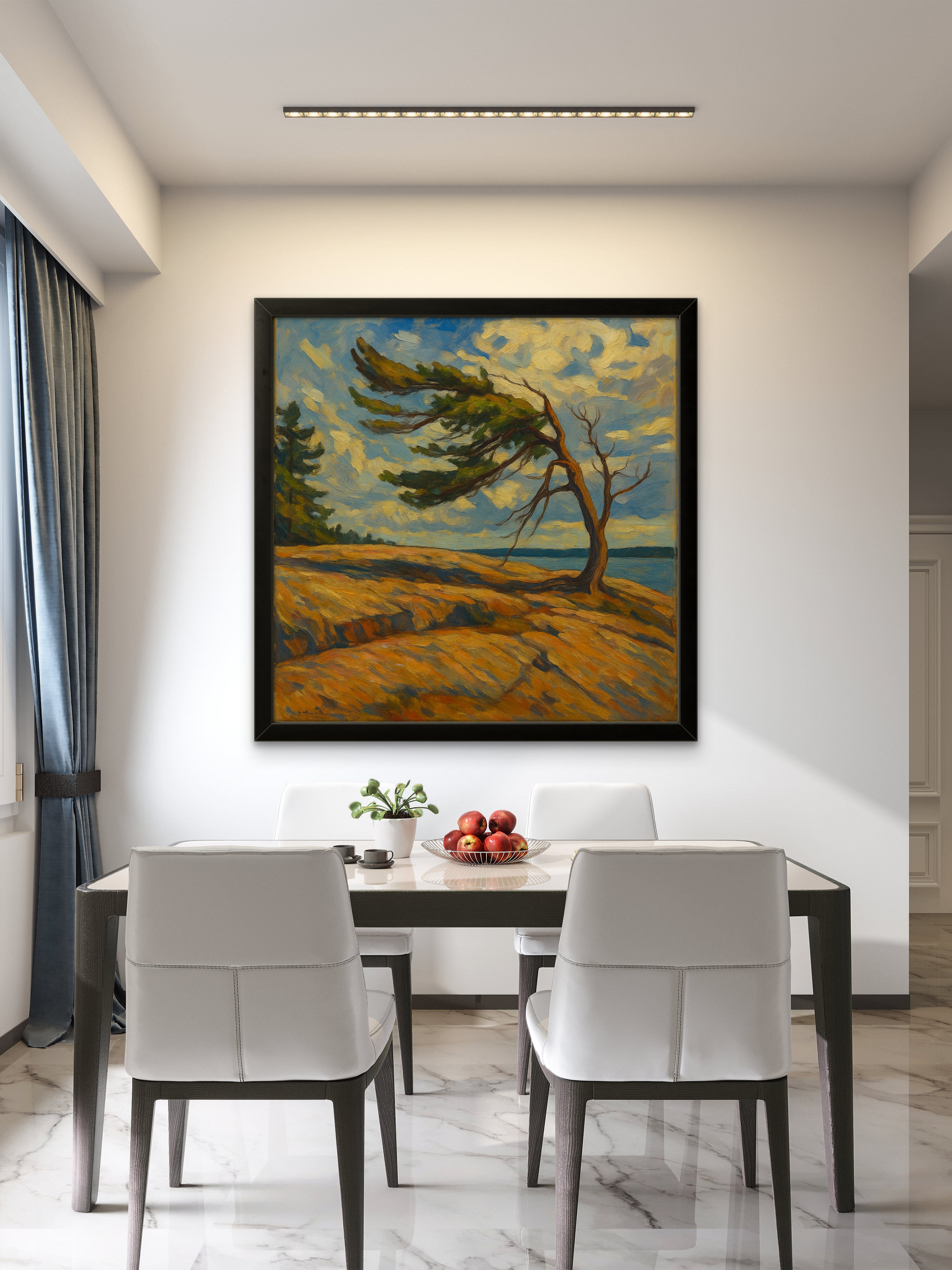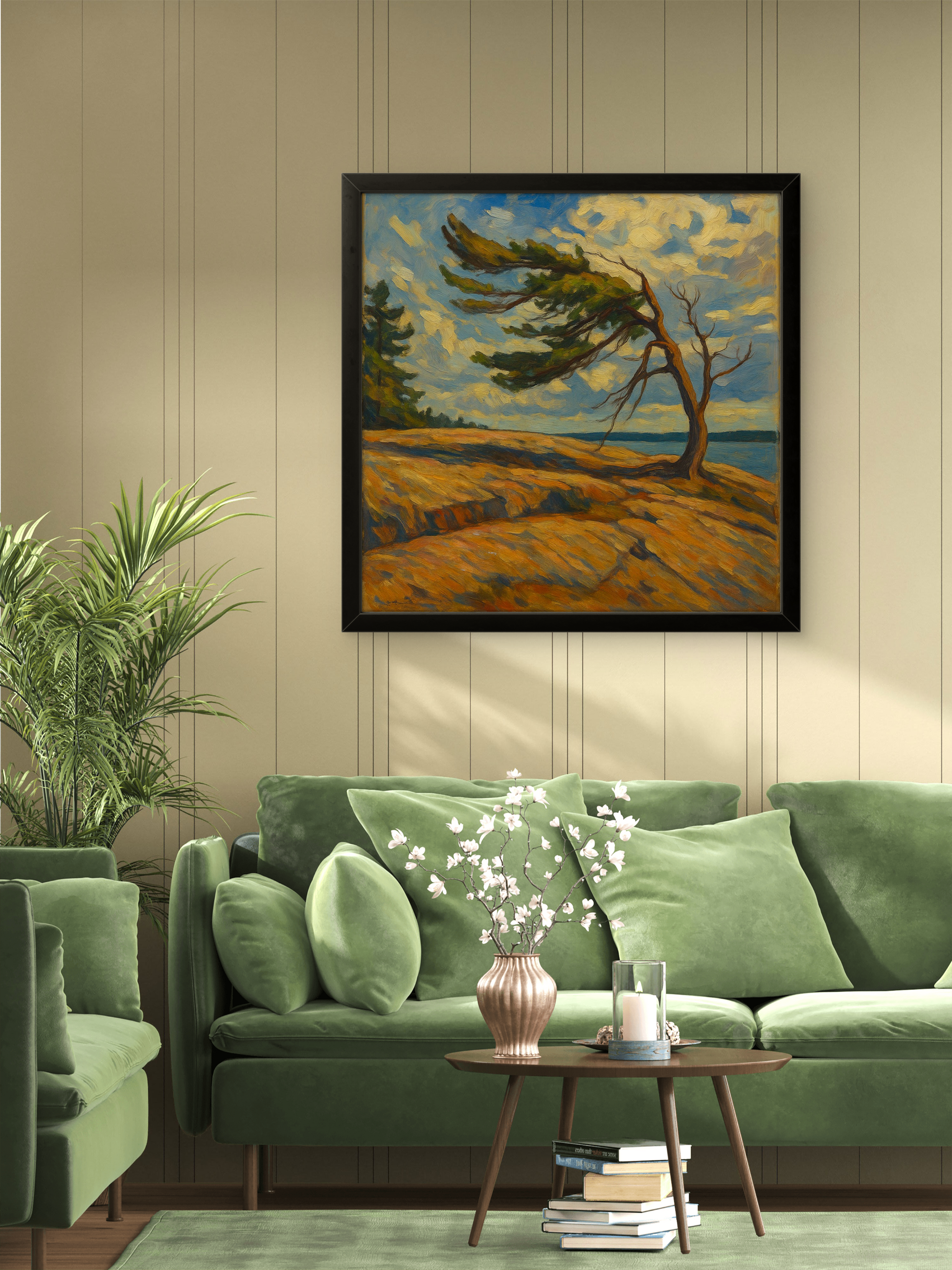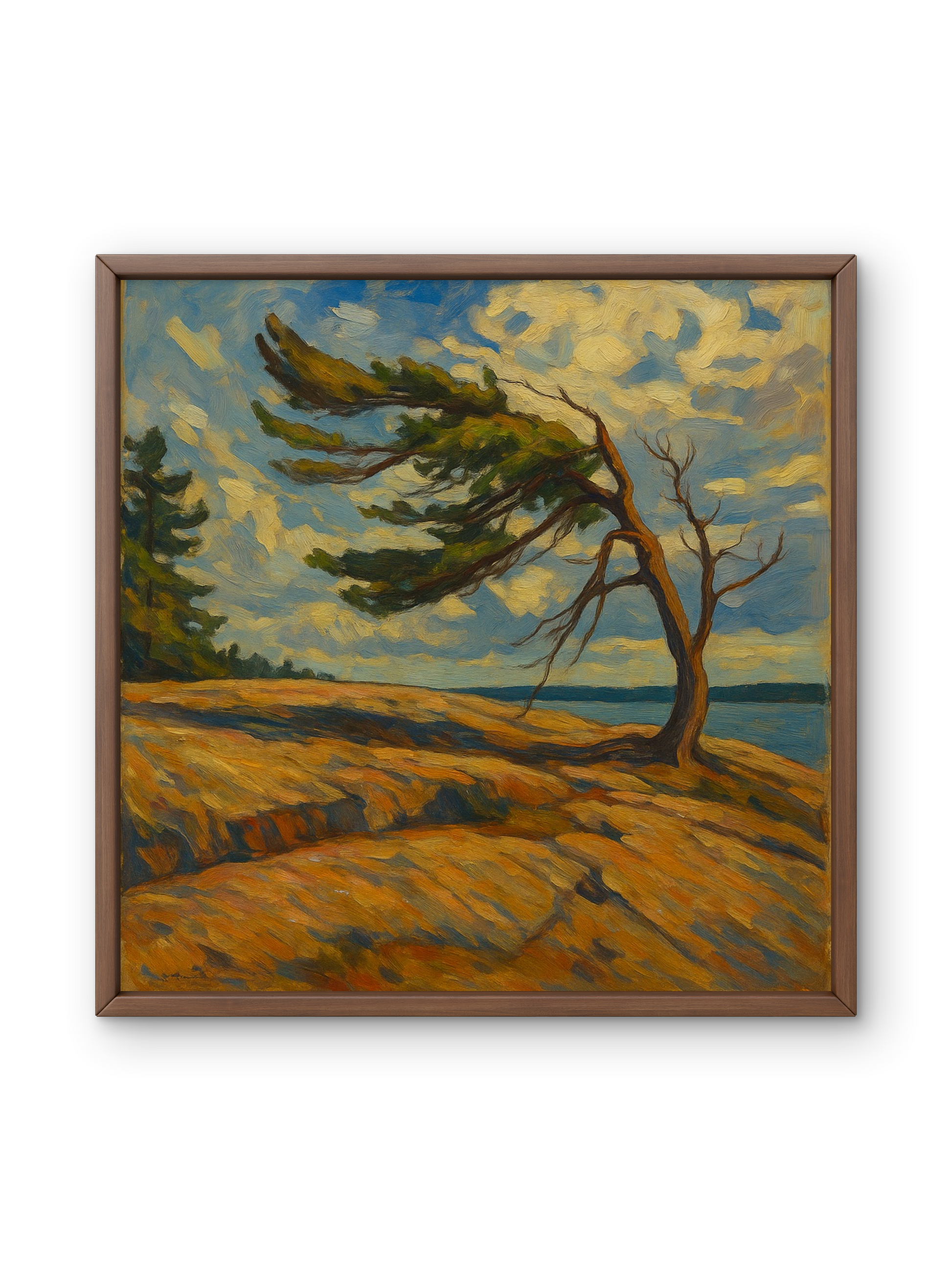 Bent but unbroken, this solitary tree clings to the weathered granite shores of Lake Superior—its silhouette a quiet testament to resilience. Painted in the expressive, bold brushstrokes reminiscent of the Group of Seven, The Sentinel of Superior captures the raw, untamed beauty of Canada's northern wilderness.