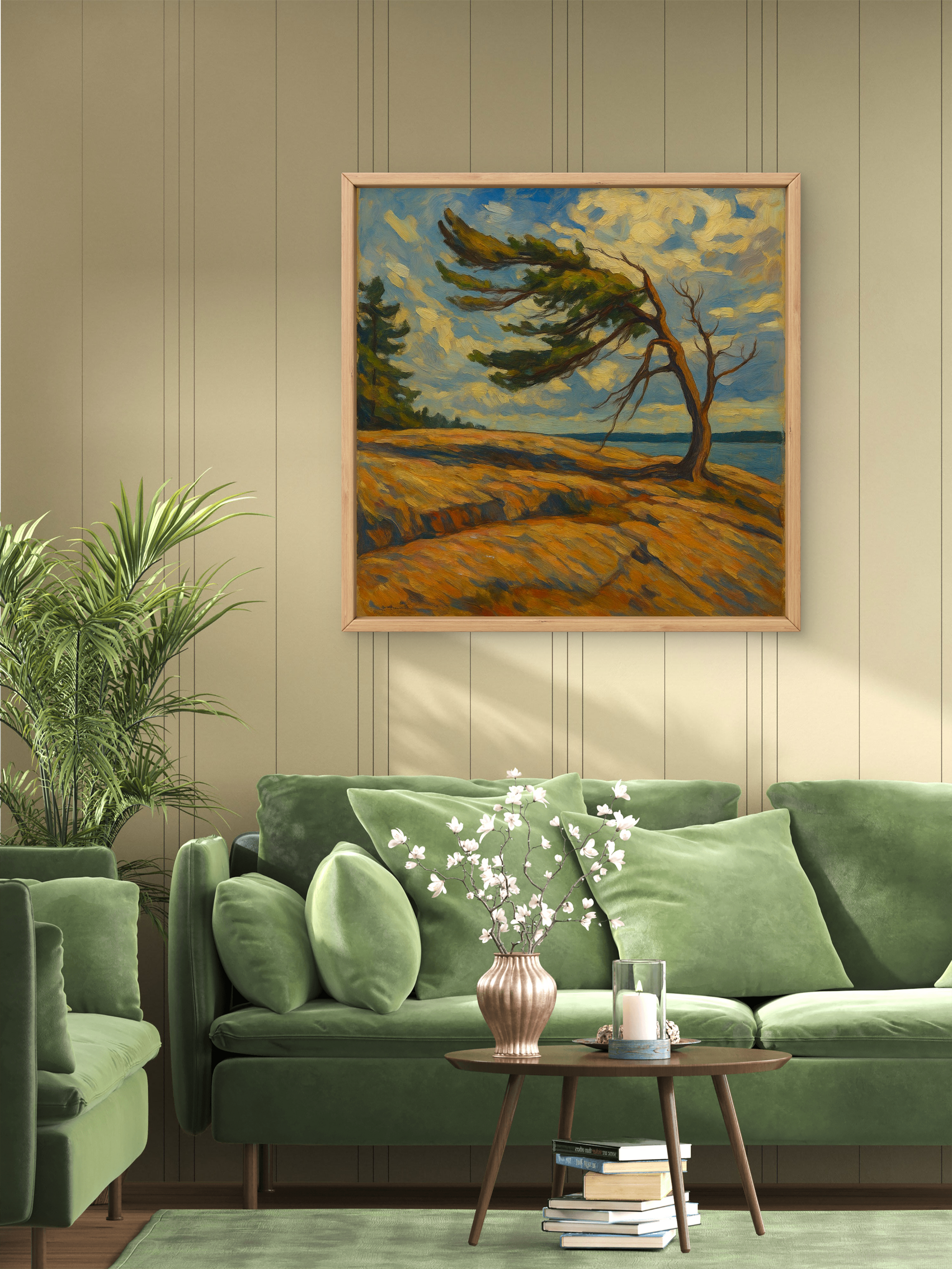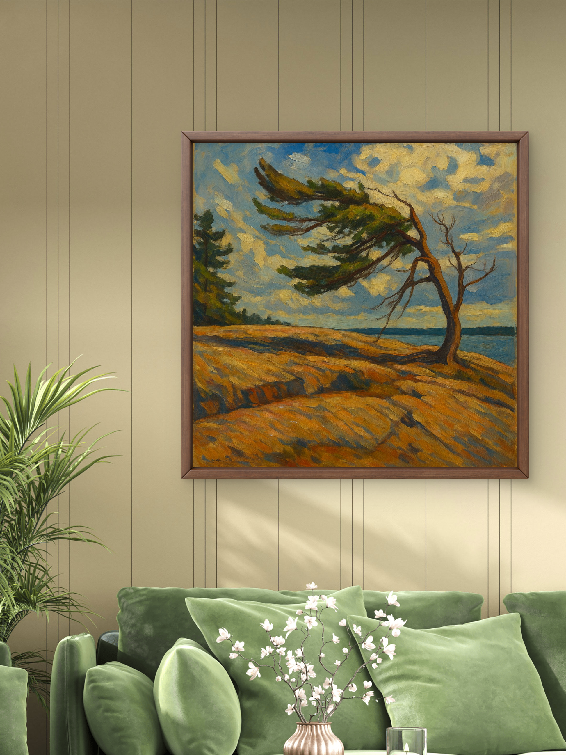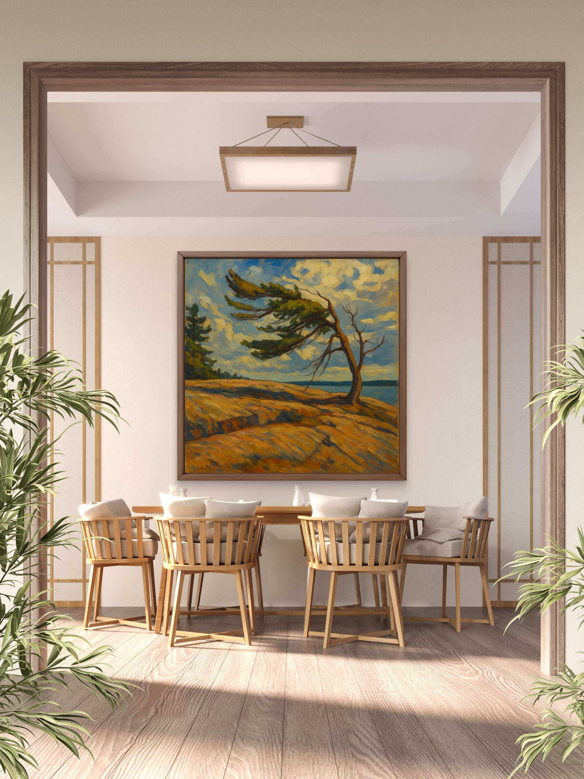 Bent but unbroken, this solitary tree clings to the weathered granite shores of Lake Superior—its silhouette a quiet testament to resilience. Painted in the expressive, bold brushstrokes reminiscent of the Group of Seven, The Sentinel of Superior captures the raw, untamed beauty of Canada's northern wilderness.