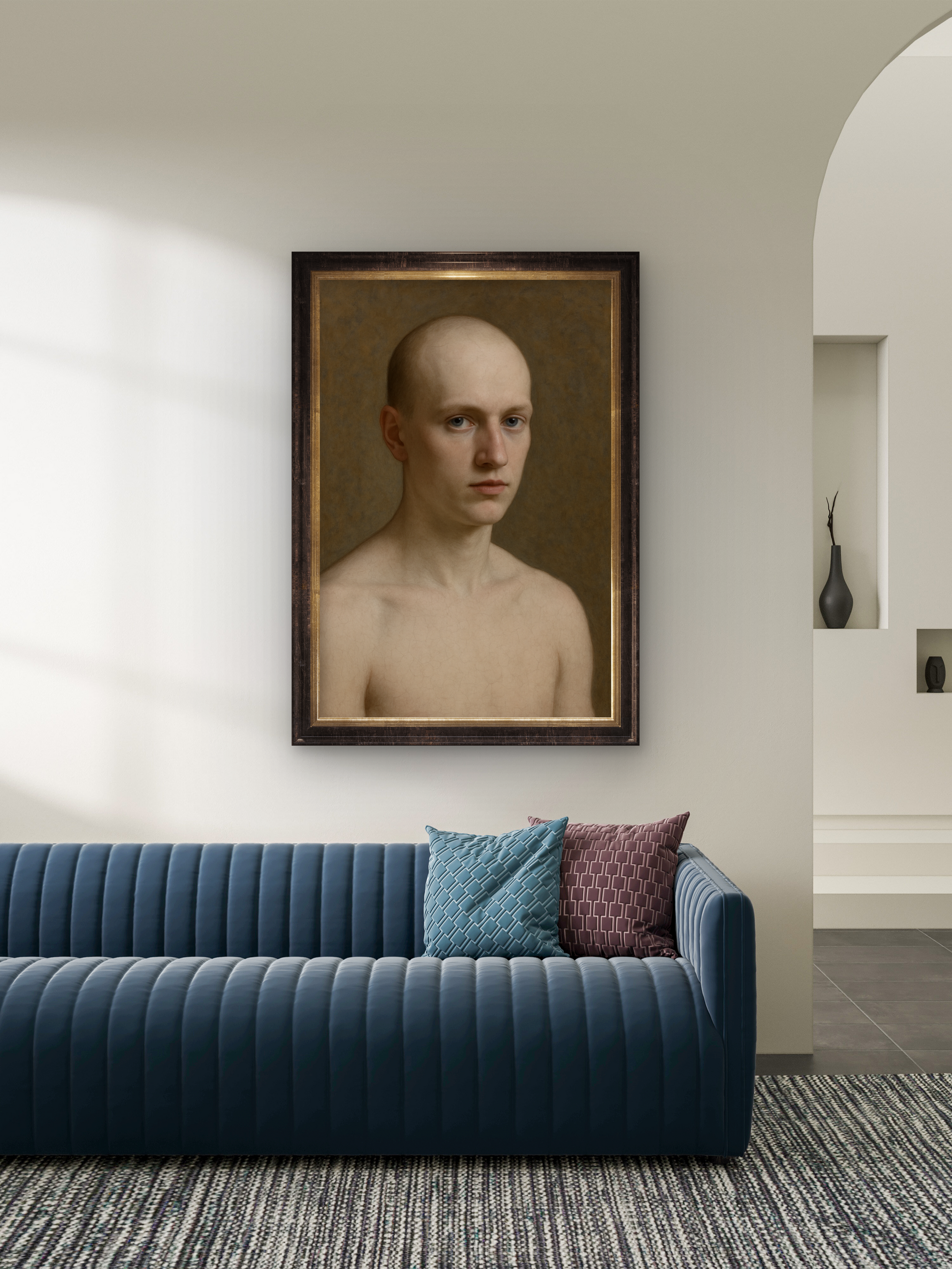 Rendered with near-monastic stillness, The Unadorned captures a subject suspended in quiet confrontation. With a gaze that pierces yet withholds, this portrait asks: what remains when we strip away artifice, adornment, and expectation? His complete hairlessness, neither diseased nor stylized, becomes a metaphor—an intentional bareness. The muted palette and hyperreal detail evoke Renaissance craftsmanship with modern psychological weight.